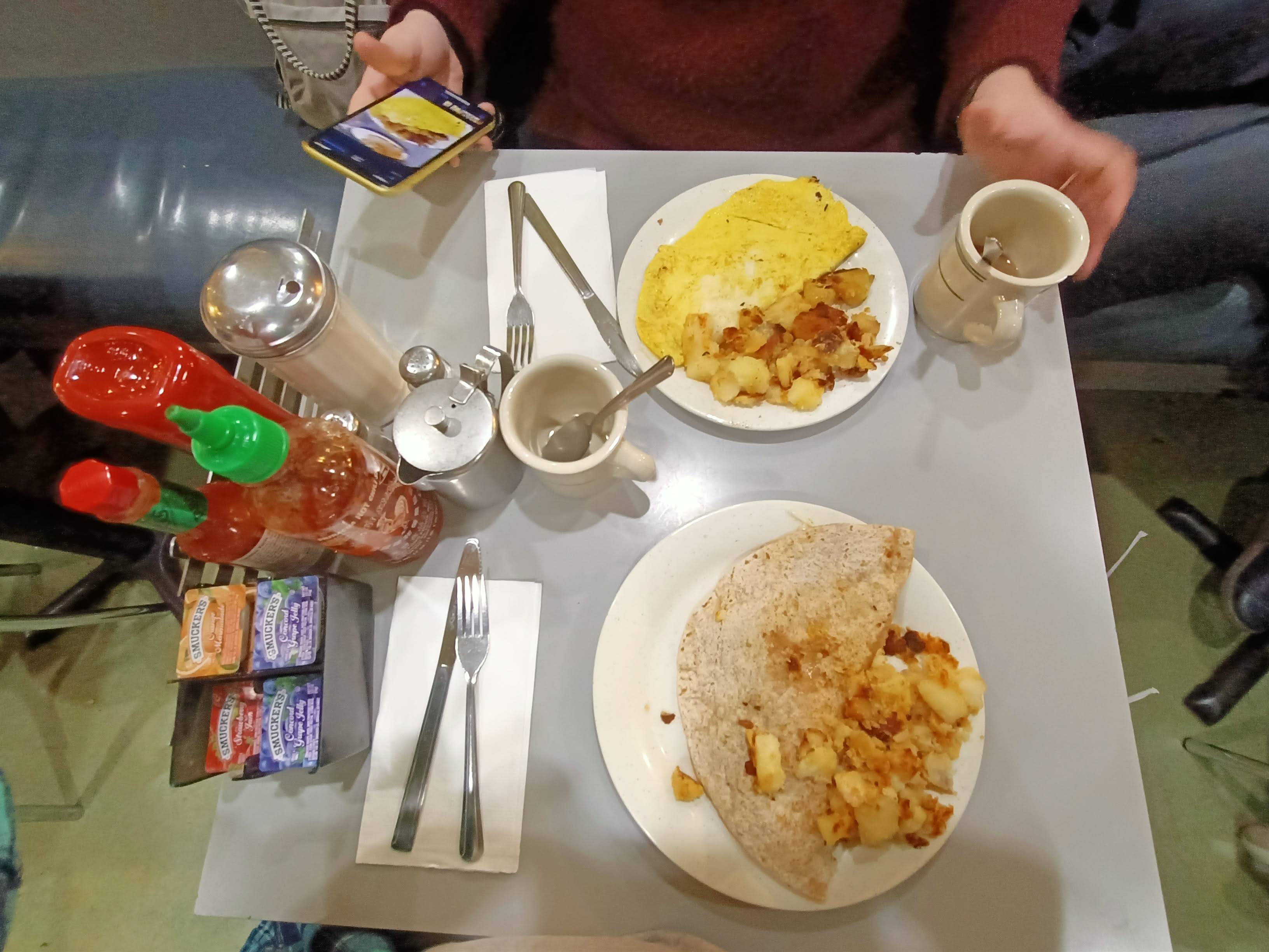 Un ‘special’ de desayuno no llega a 10 dólares, excepto el de bistec que era un poco más caro pero puedes degustar unos huevos Benedict con patatas fritas, el zumo y todo el café que quieras por 9,95 dólares.